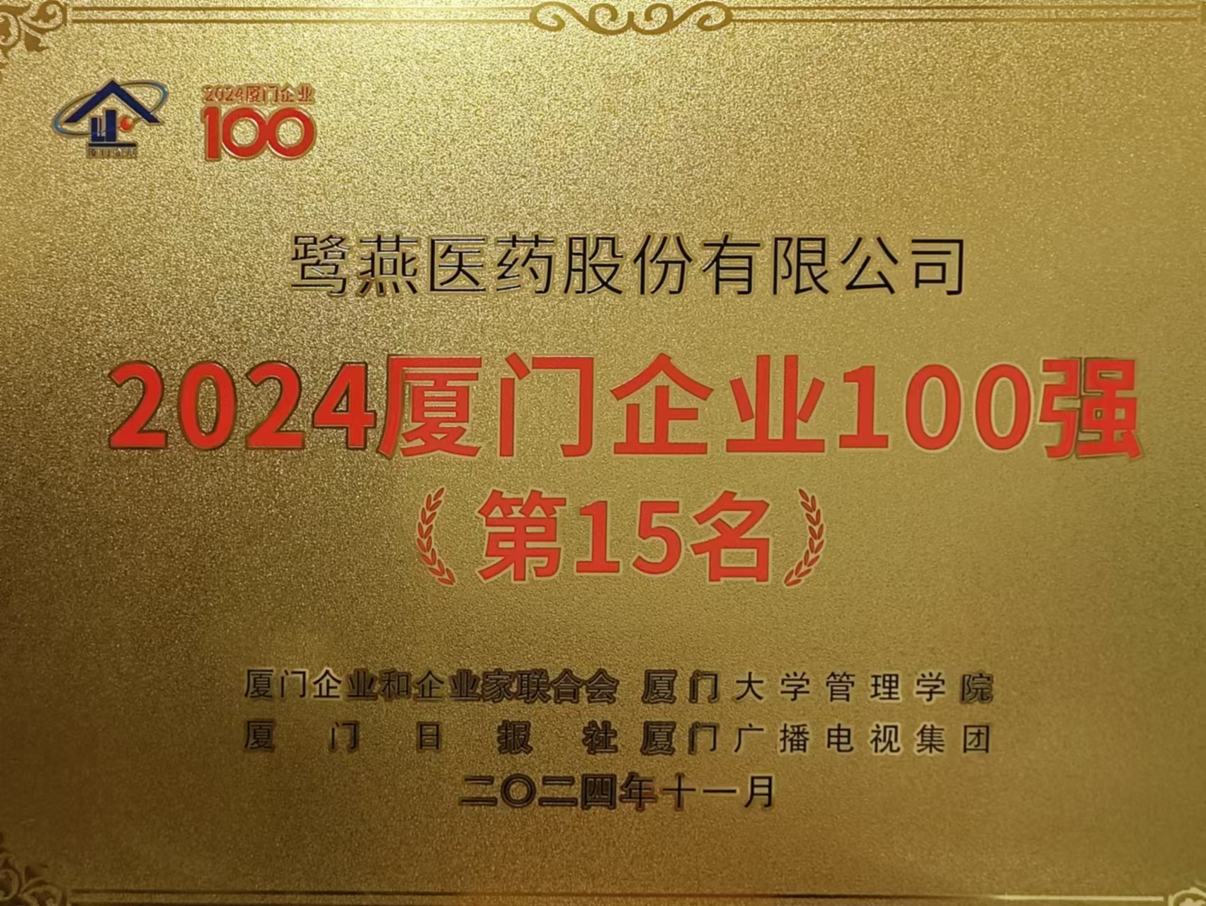 2024年11月,廈門企業和企業家聯合會發布2024廈門企業百強榜單,鷺燕醫藥股份有限公司榮列第15位!