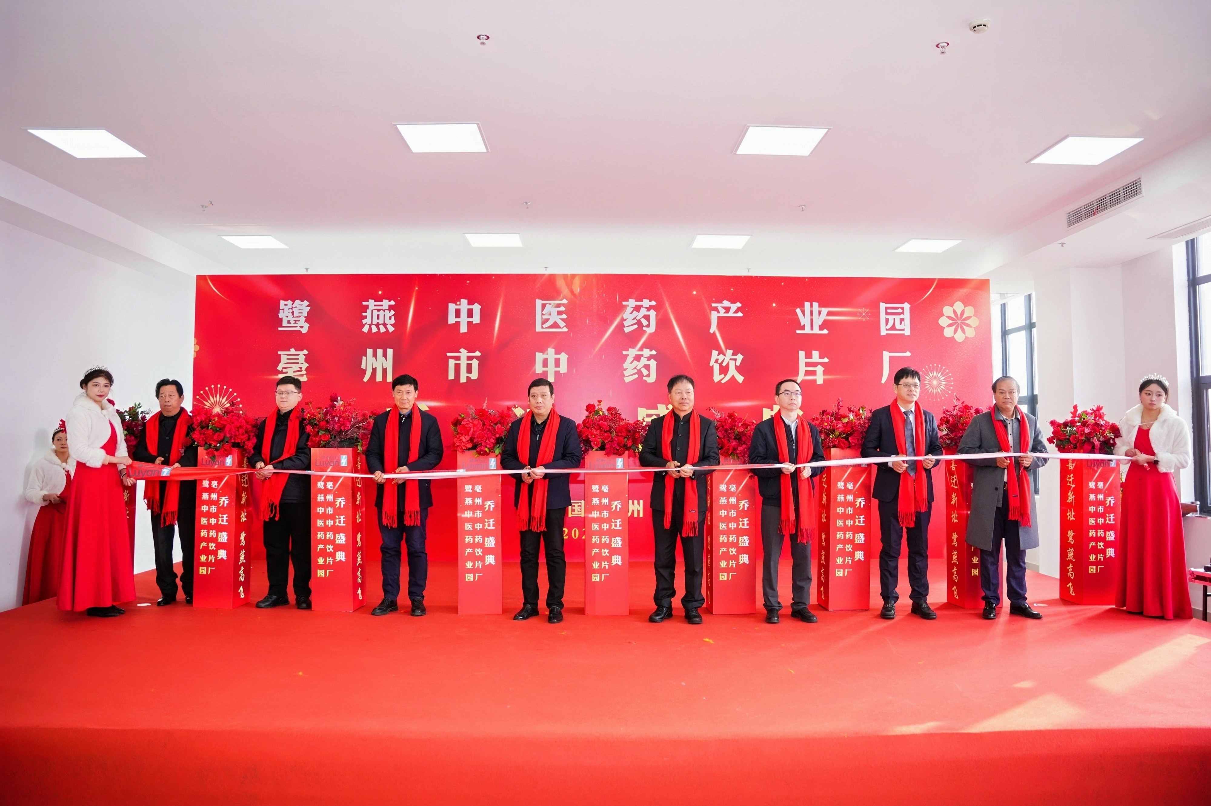 亳州市譙城區區長宋保眾、鷺燕集團董事長吳金祥、副總裁朱明國等執剪共啟,為產業園“開業大吉”!宋保眾區長盛贊:“產業園是亳州打造‘世界中醫藥之都’的新引擎!”