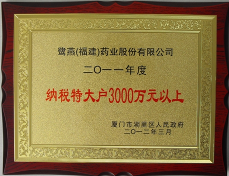 鷺燕(福建)藥業股份有限公司榮獲“2011年度納稅特大戶3000萬元以上”稱號